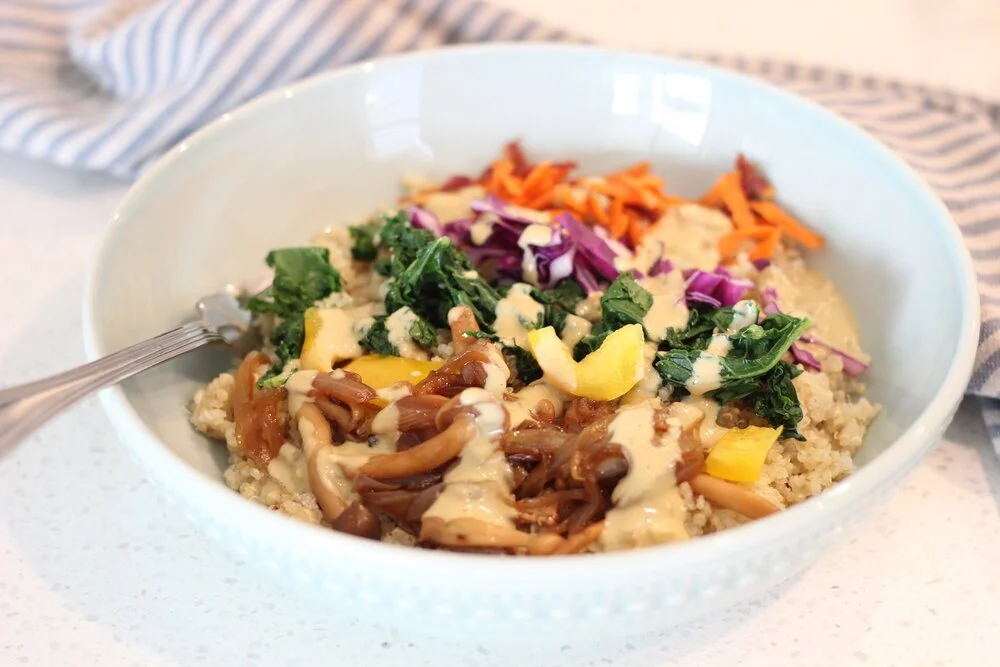 One of my faves: Rainbow Power Bowls. In an irresistible cheesy tahini dressing that gives this dish a POP of flavour!