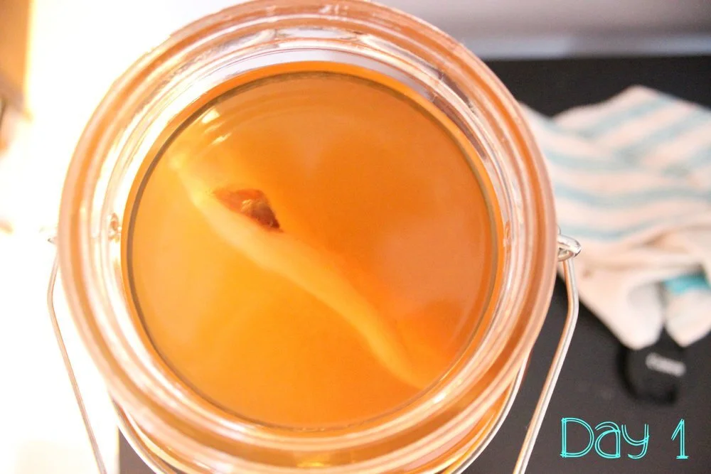 A quick recap: make a new batch of sugar tea, then add your scoby + starter tea to it, let it sit covered for 5 - 30 days, bottle kombucha and drink OR start a second round fermentation to flavour, then keep your new baby scoby (you will now have two instead of one) or donate it to a friend so they can get in on the fun!