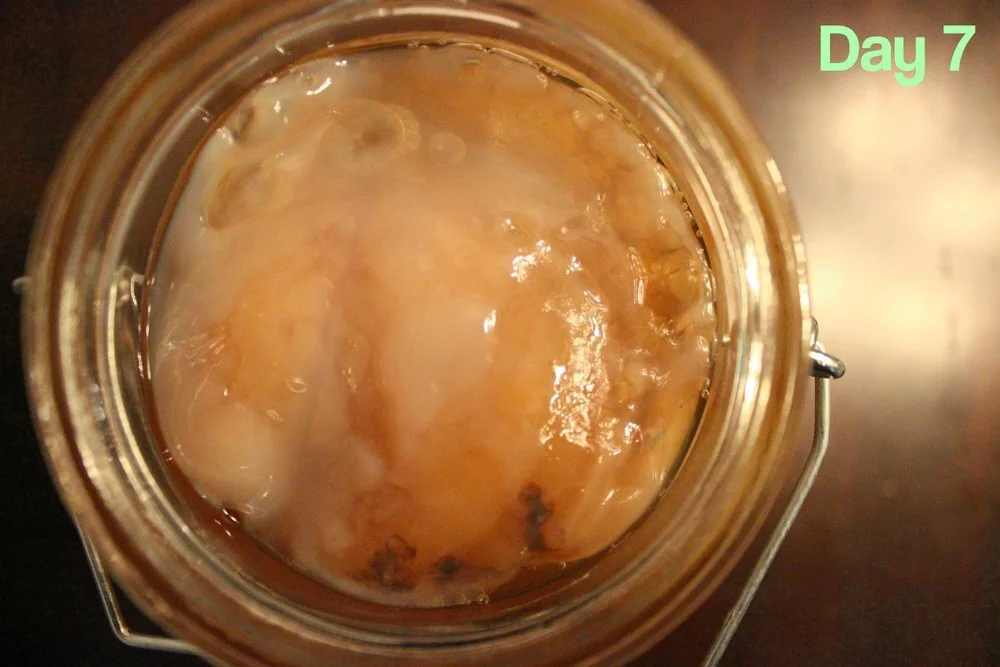 I skipped ahead a few days after Day 2, and in Day 7's picture, the white you see in the upper left portion of the jar is the new baby scoby forming (and my mother scoby did actually float up and they joined together):