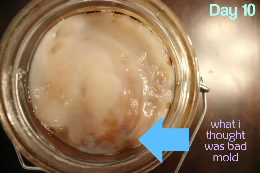 I actually thought I had messed up by Day 10 and that 'bad' mold was forming, but it was just my new baby scoby sitting over the mother scoby that made it look like greenish mold. Phew!