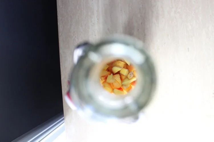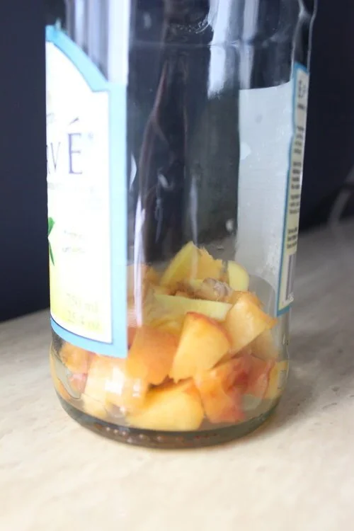 2. Get an airtight bottle and add your desired flavour combinations to it. (Organic peach and ginger in the below photos.)