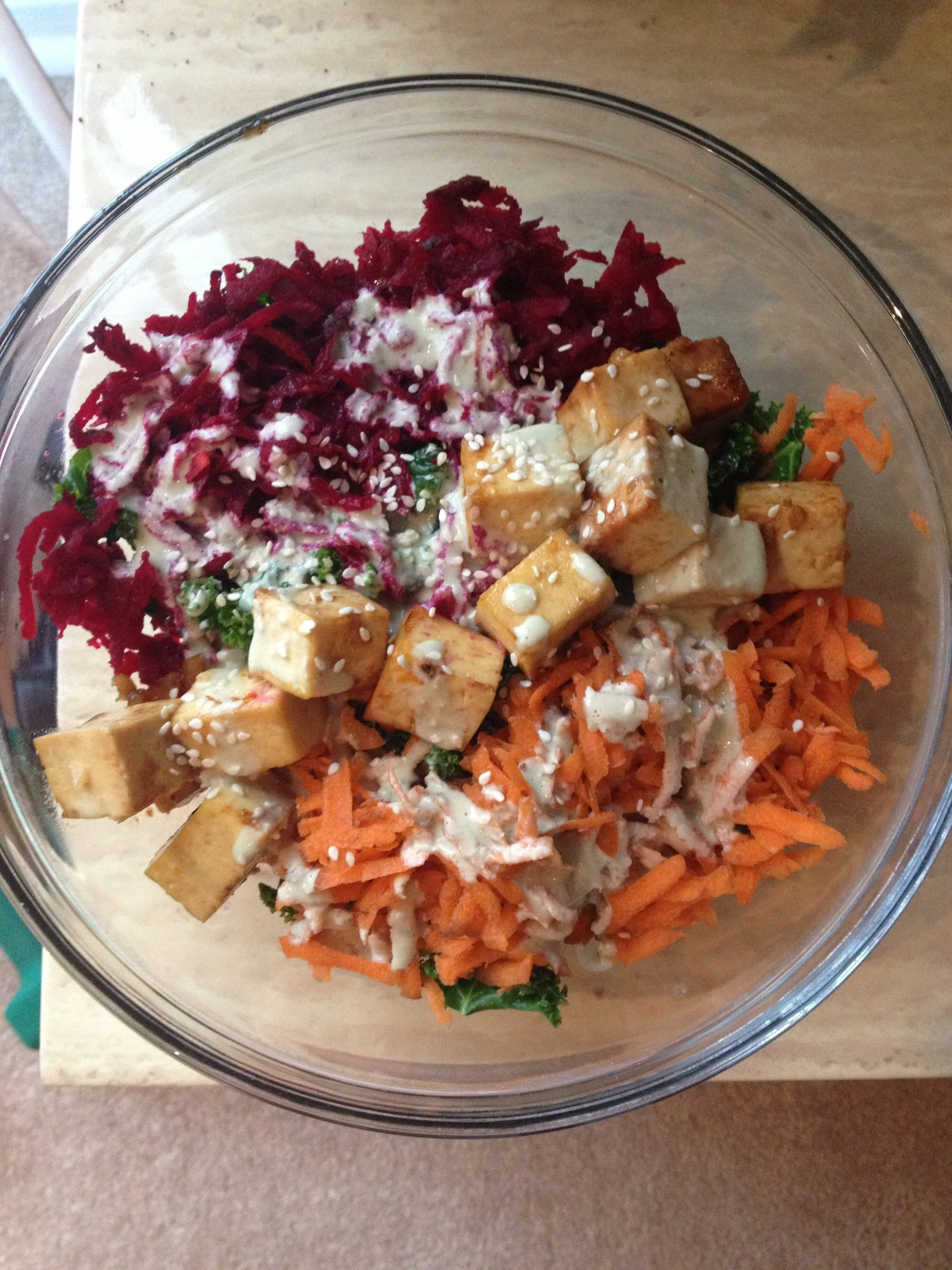Braised organic Kale on a bed of organic brown rice, with gluten-free tamari, shredded raw carrots and beets, topped with a cashew ginger sauce and marinated (orange marinade) tofu then sprinkled with sesame seeds.